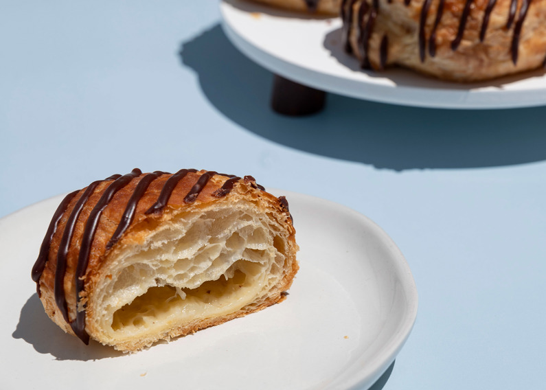 A festive winter treat, this Almond Danish Doughnut is filled with peppermint vanilla custard, topped with whipped cream cheese frosting, and garnished with a gingerbread snowflake cookie, powdered sugar, and shimmering holiday sprinkles. Perfect for bakery cases and winter menu features.